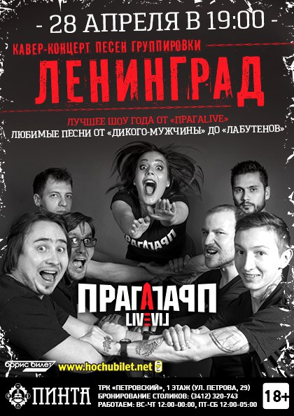 Привет всем! На связи - ПрагаLIVE. Приглашаем тебя и твоих драйвовых друзей на наш второй ежегодный (а по тому почти уже традиционный) кавер-концерт. Всё вдохновение, все эмоции, все песни и вообще все самое лучшее мы взяли от группировки «Ленинград». Классику а-ля Шнур мы наполнили своей колоритной дичью — это нужно услышать, хотя, в нашем случае и с нашей энергетикой — услышать и УВИДЕТЬ лично! Новые лица, новые треки, новое звучание, старые добрые танцы — такой ПрагуLIVE вы еще не знали! В программе: любимые треки от «Дикого мужчины» до «Лабутенов», живые эмоции, живой звук и по-настоящему живые люди (ну, вы поняли — не эти прилизанные у микрофона, как их там...). Будем жжечь, будет искрить, будем давать дичь и делиться своей энергией. Вообщем, приходи. Ждем. 28 апреля. «Пинта» в Петровском. Строго 18+.