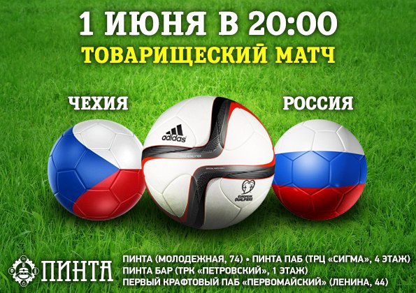 Перед ЕВРО 2016 нашей сборной осталось провести два контрольных матча и первый стартует уже завтра! Товарищеский матч. Чехия - РОССИЯ Начало прямой трансляции в 19:00 (время ижевское). Матч будет показан во всех заведениях ПИНТА на больших экранах! Поддержим наших ребят!