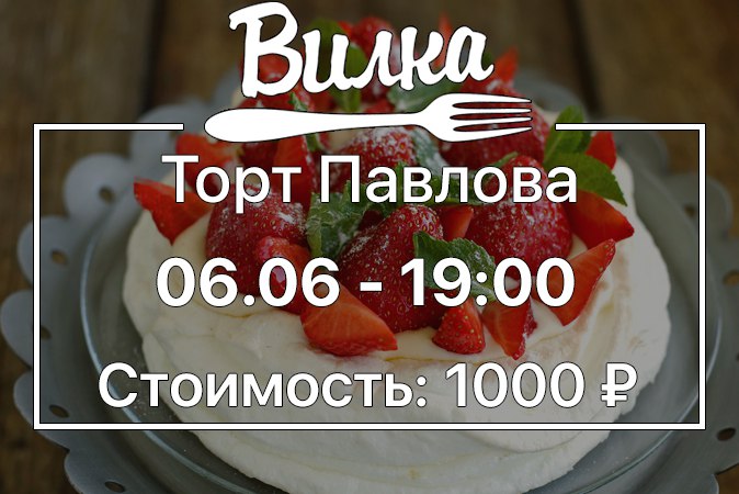 МК - Торт Павлова 19:00 Понедельник, 06.06.2016 Любите сладкое? А торты? Сильно-сильно? Тогда вам нужно обязательно посетить наш мастер-класс на котором мы будем готовить торт Павлова. Время: 6 июня 19:00 Стоимость: 1000 рублей. По всем вопросам звонить по телефону 235-003
