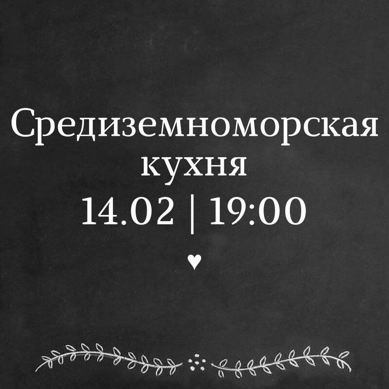 МК: Средиземноморская кухня 19:00 Вторник, 14.02.2017 Освободились места на 14 февраля! Звоните по тел. 235-003 Праздничная стоимость 3500₽ с пары!
